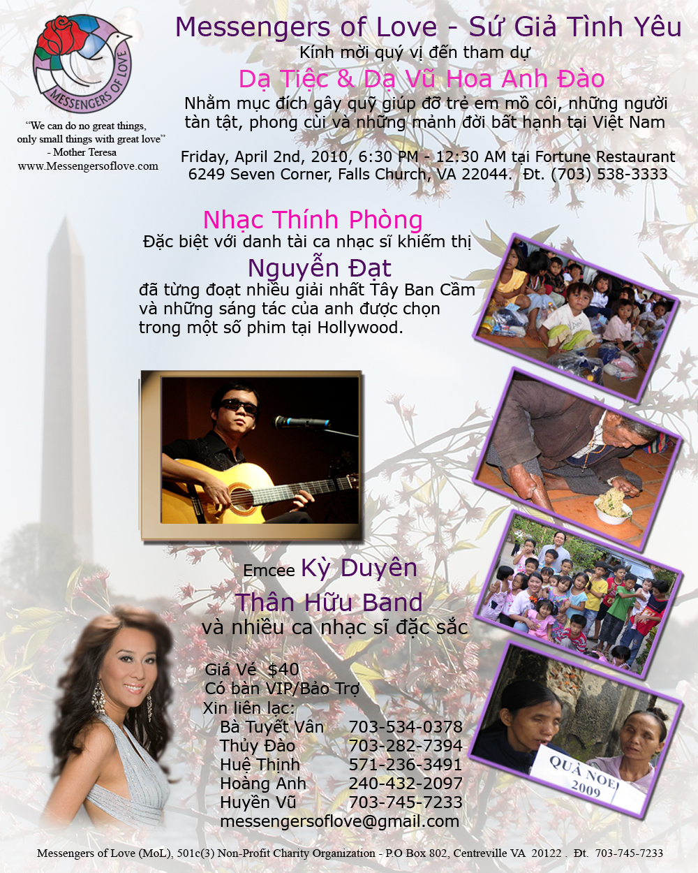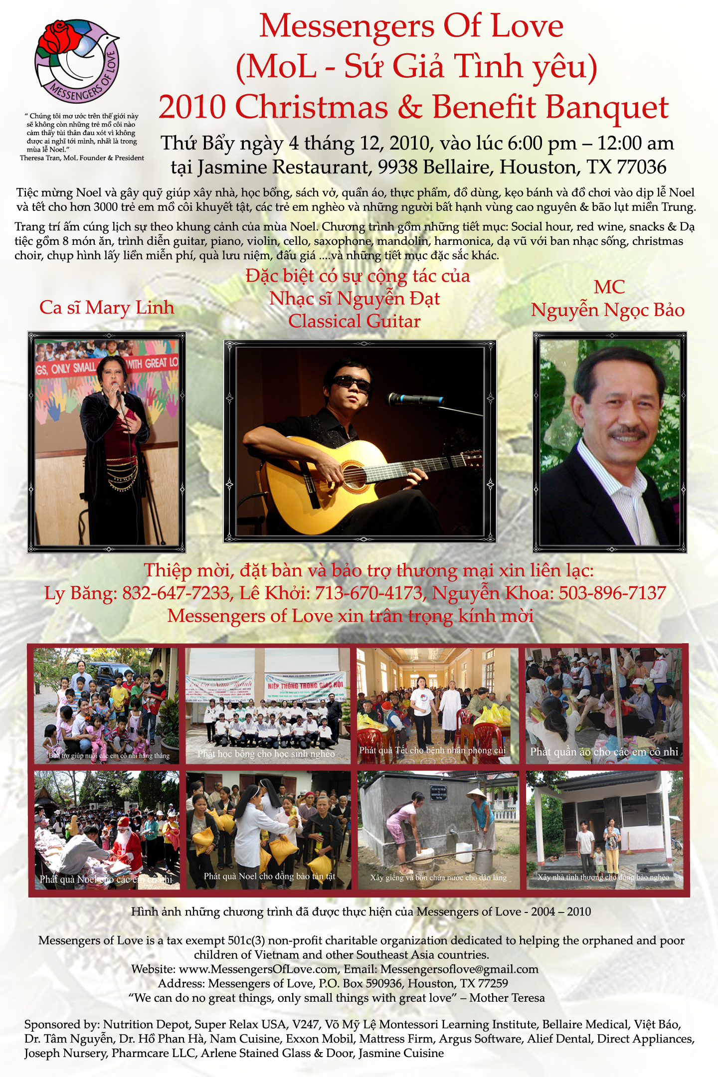 Messengers of Love is organizing a Holiday Benefit dinner, show and dance (6:30 PM-1:00 AM) on December 8, 2007 at Canvas Bistro on Beechnut (at the corner of Beechnut and Wilcrest) to celebrate Christmas and to benefit the orphans and poor children of Vietnam.